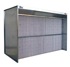 Suitable for the continuous painting of large pieces, with fans fitted with a high-performance backward inclined spark proof impeller. Also available with extended walls and roof (version B) which optimize the capture speed at a distance of 1 m from the extracting front. They are supplied fitted as standard with lamp and paper filter